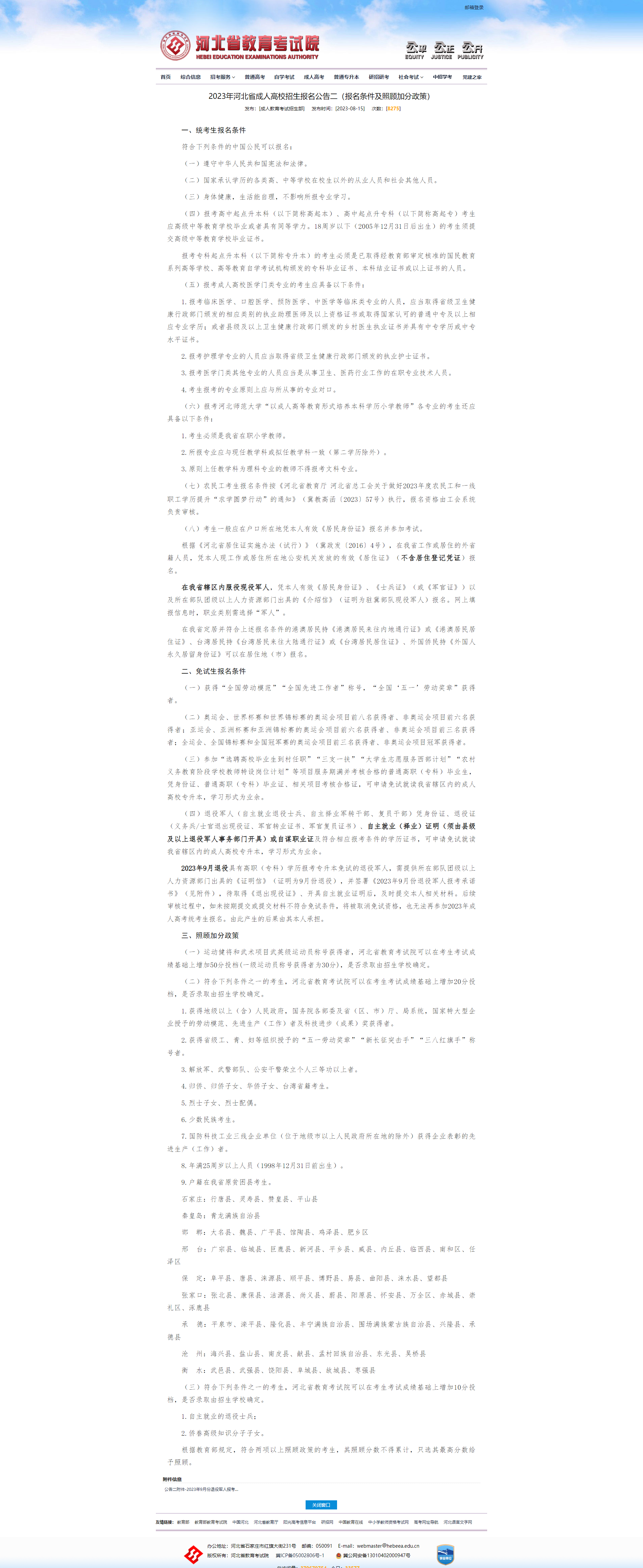 2023年河北省成人高校招生报名公告二 (报名条件及照顾加分政策)